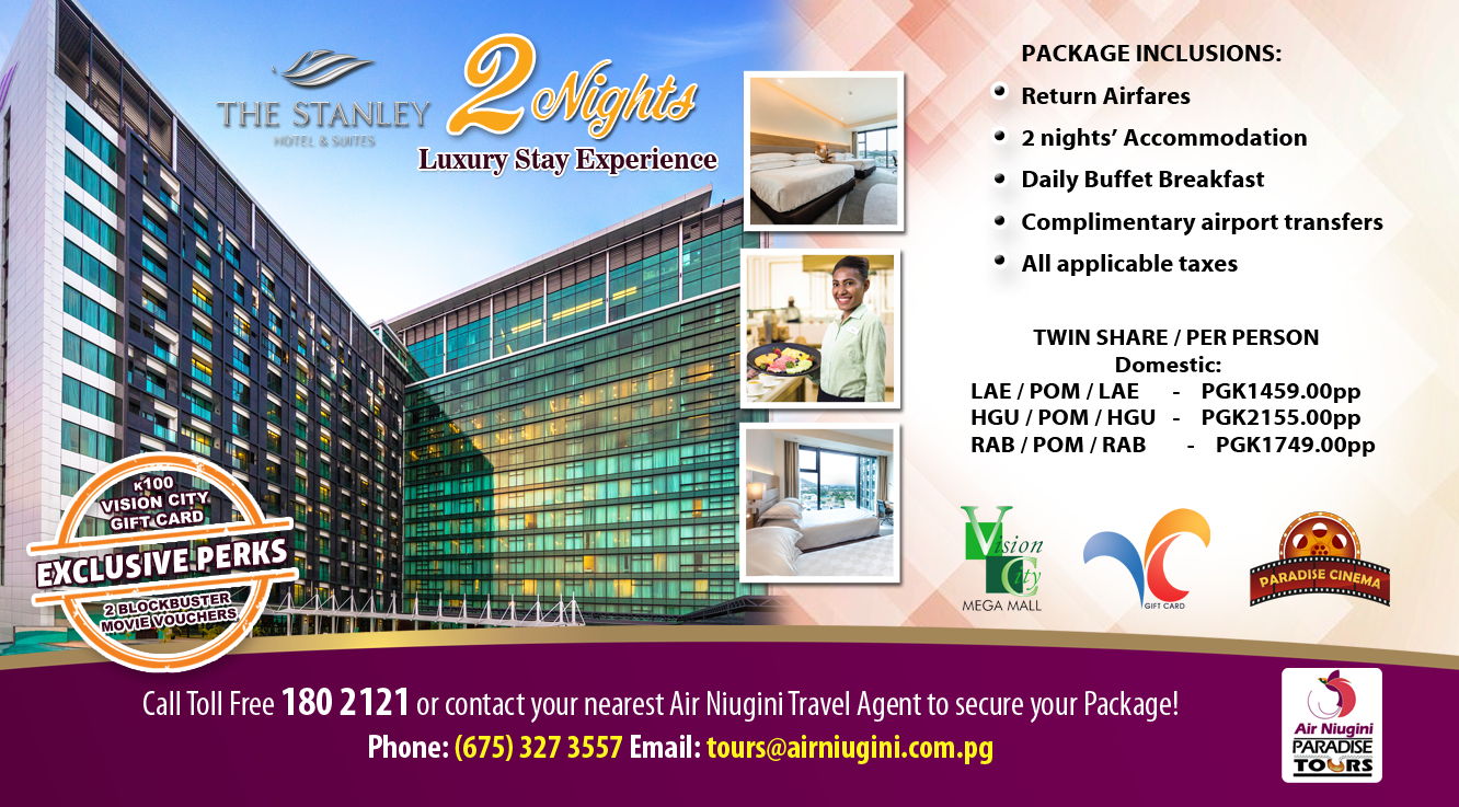 Enjoy the two nights of luxury stay experience at the Stanley Hotel & Suites if you purchase domestic flights from LAE-POM-LAE, HGU-POM-HGU or RAB-POM-RAB.