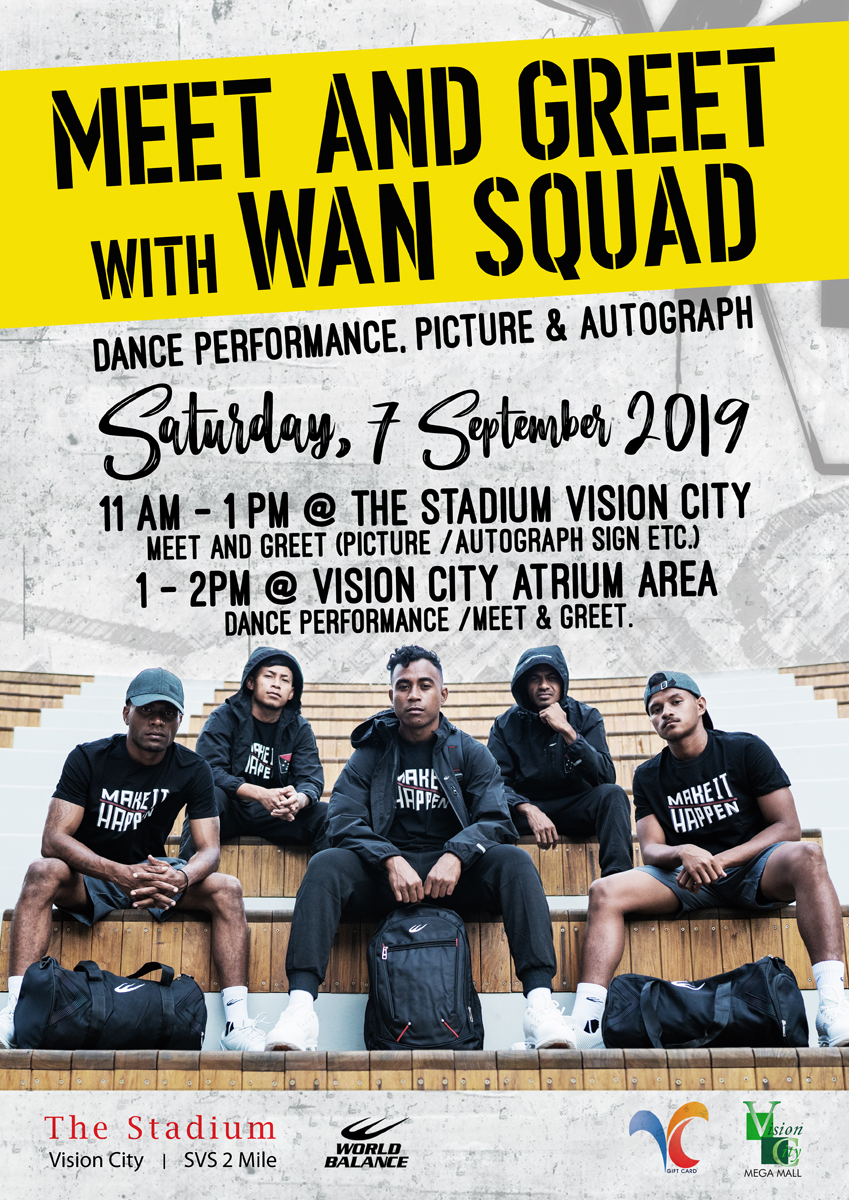 Wan Squad will be here at Vision City Mega Mall for a meet and greet session on Saturday, 7thof September 2019. Thanks to The Stadium’s brand ‘World Balance’ who’s sponsoring this event and making it possible for you to meet them all. Don’t miss to take photos and get autographs with your favourite dance crew on 7th September at Vision City Mega Mall.